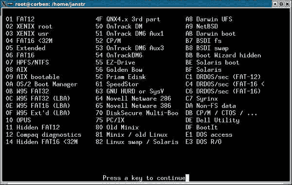 Otrzymasz listę różnych typów. Naciśnij spację i otrzymasz dalszą część listy. Odnajdź typ partycji, który potrzebujesz i wpisz jego numer. (Linux swap to typ 82,systemy plików Linux to 83)